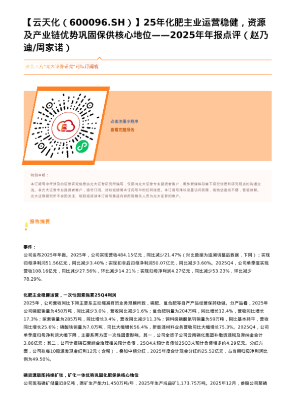 【光大证券】【202603】25年化肥主业运营稳健,资源及产业链优势巩固保供核心地位——2025年年报点评-2页 证券期货研究报告