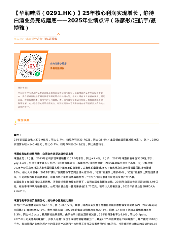 【光大证券】【202603】25年核心利润实现增长,静待白酒业务完成磨底——2025年业绩点评-2页 证券期货研究报告