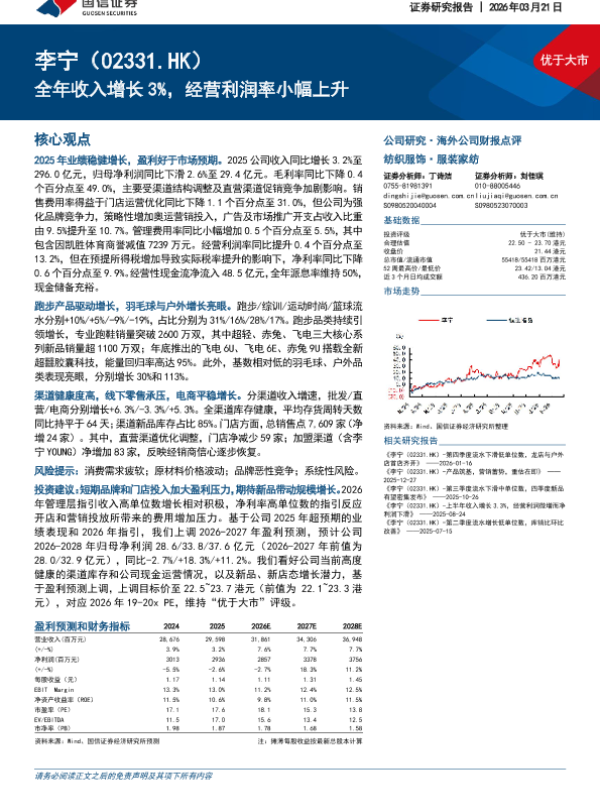 【国信证券】【202603】2026年03月21日 优于大市 李宁(02331.HK)全年收入增长 3%,经营利润率小幅上升-14页 证券期货研究报告