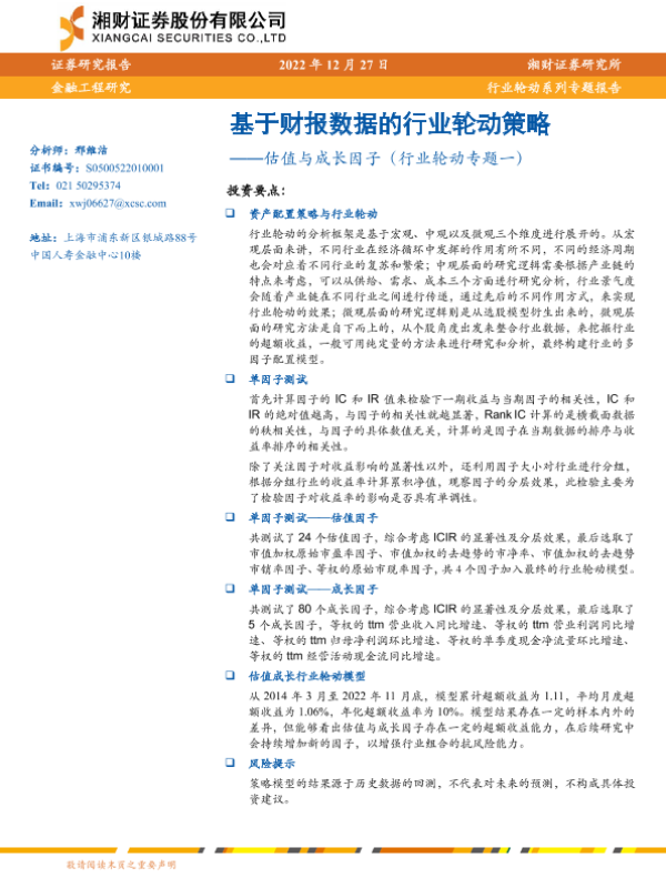 【湘财证券】【20221227】估值与成长因子(行业轮动专题一):基于财报数据的行业轮动策略-29页 行业研究