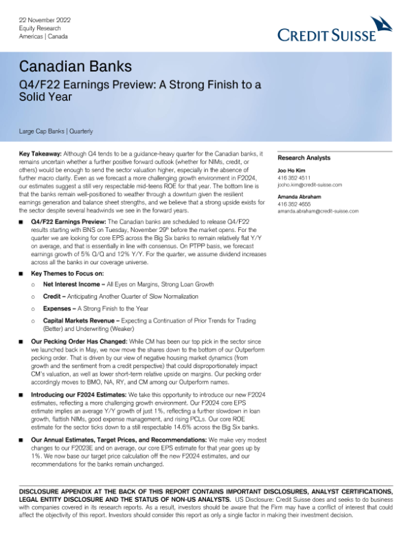 【Credit Suisse】【20221122】Canadian Banks Q4/F22 Earnings Preview A Strong Finish to a Solid Year-43页 行业研究