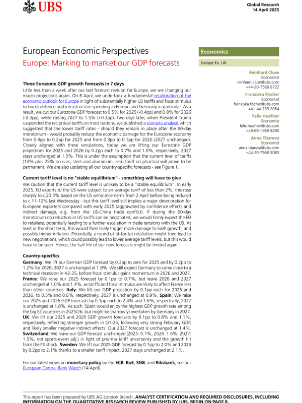 【UBS AG London Branch】【20250414】European Economic Perspectives Europe Marking to market our GDP forecasts-11页 宏观策略