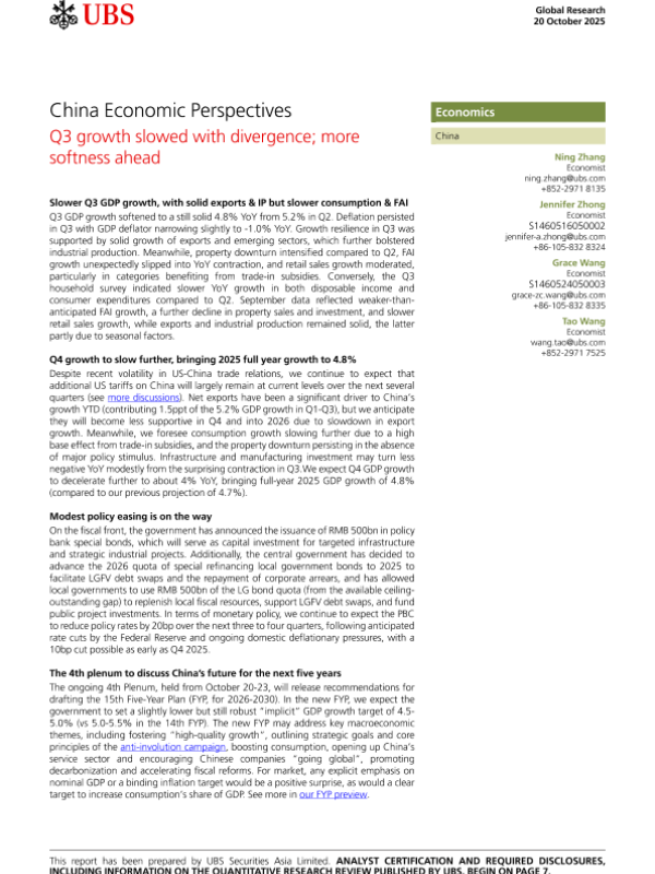 【UBS】【2025】China Economic Perspectives Q3 growth slowed with divergence; more softness ahead-10页 宏观策略
