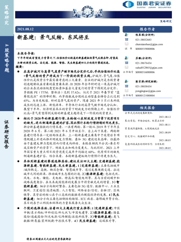 【国泰君安证券】【20210812】A股策略专题:新基建,景气反转,东风将至-27页 行业研究