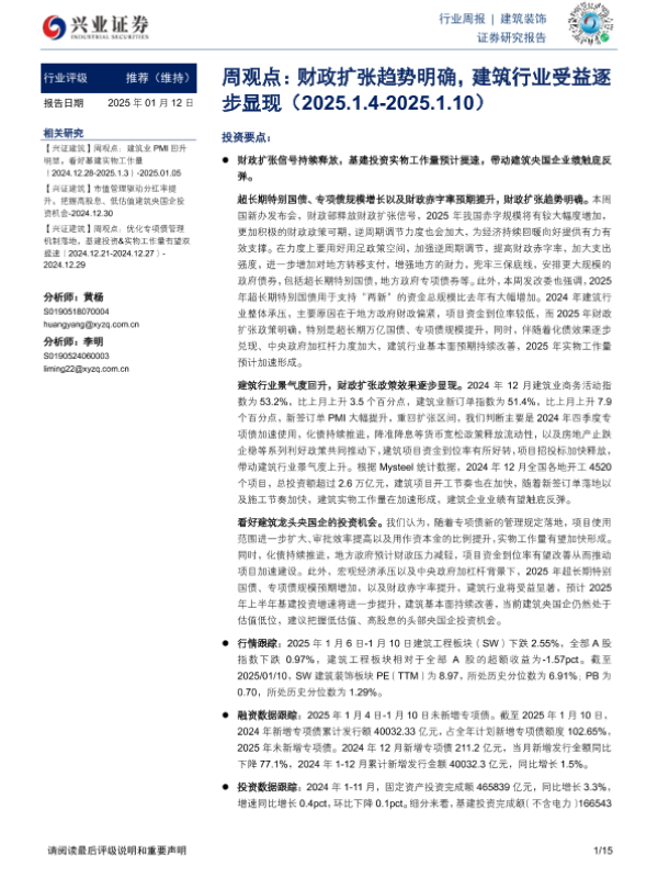 【兴业证券】【20250112】建筑装饰行业周观点:财政扩张趋势明确,建筑行业受益逐步显现-15页 行业研究