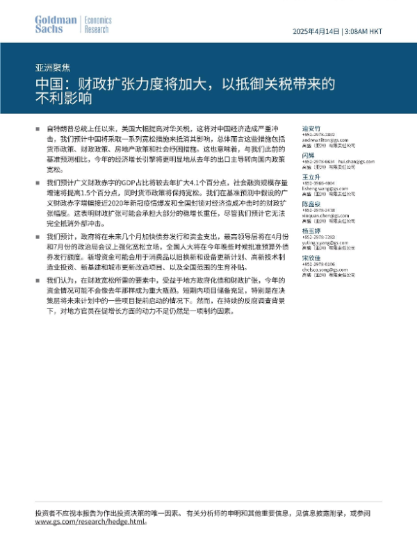 【Goldman Sachs】【20250414】中国:财政扩张力度将加大,以抵御关税带来的不利影响-11页 宏观策略