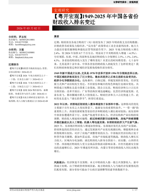 【粤开证券】【202603】【粤开宏观】1949-2025年中国各省份财政收入排名变迁-17页 证券期货研究报告
