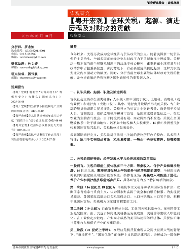 【粤开证券】【202508】【粤开宏观】全球关税:起源、演进历程及对财政的贡献-10页 证券期货研究报告