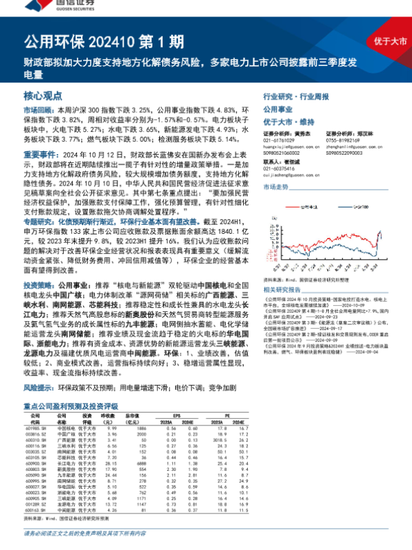 【国信证券】【20241013】公用环保行业202410第1期:财政部拟加大力度支持地方化解债务风险,多家电力上市公司披露前三季度发电量-28页 行业研究