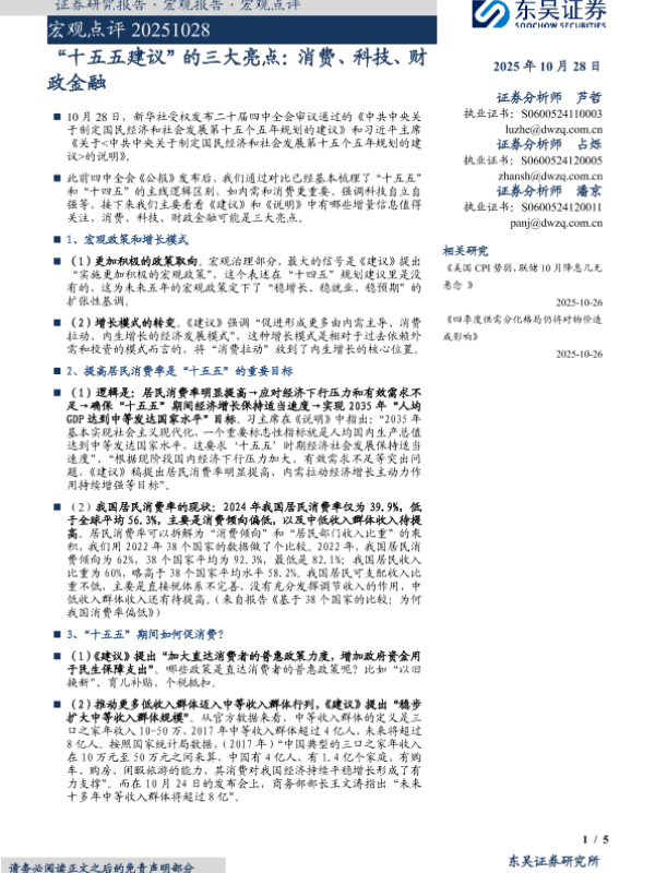 【东吴证券】【202510】“十五五建议”的三大亮点:消费、科技、财政金融-5页 证券期货研究报告