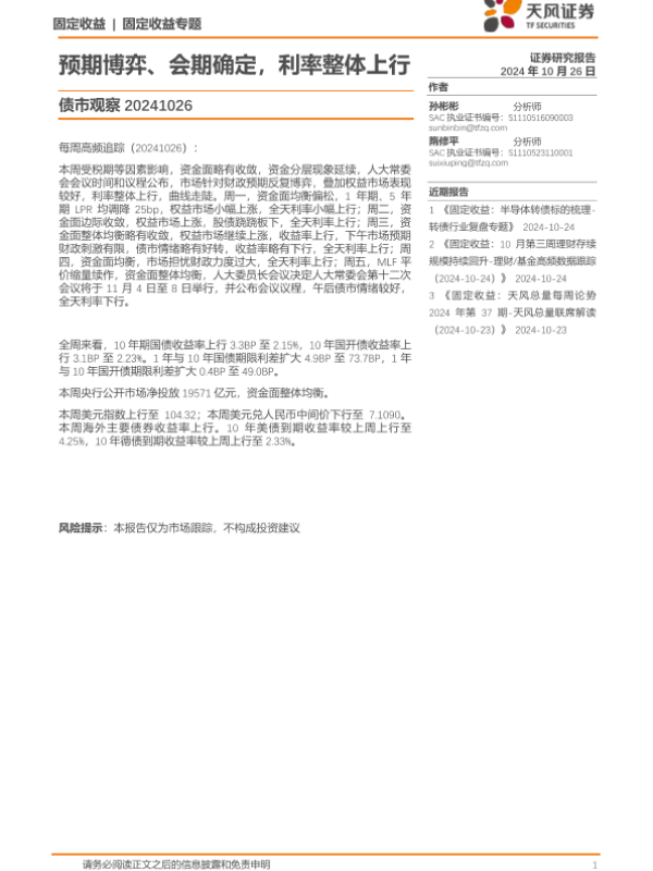 【天风证券】【20241026】债市观察:预期博弈、会期确定,利率整体上行-10页 行业研究