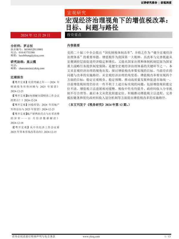 【粤开证券】【20241229】宏观经济治理视角下的增值税改革:目标、问题与路径-13页 行业研究