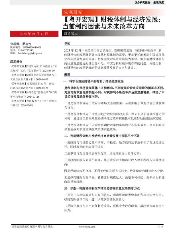 【粤开证券】【20240411】财税体制与经济发展:当前制约因素与未来改革方向-9页 宏观策略