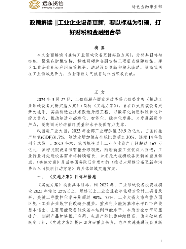 【远东资信绿色金融事业部】【20240327】工业企业设备更新,要以标准为引领,打好财税和金融组合拳-6页 行业研究
