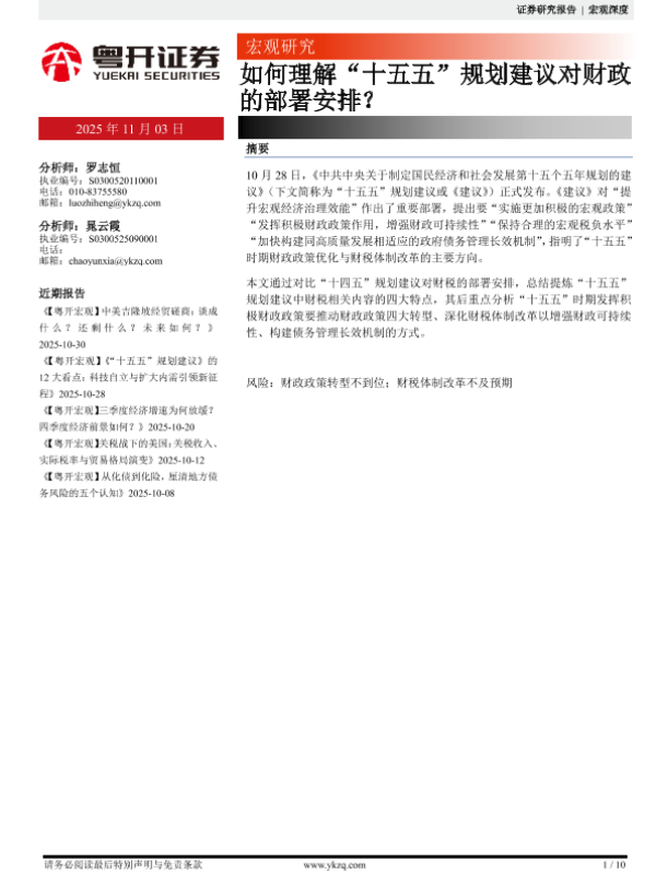 【粤开证券】【202511】如何理解“十五五”规划建议对财政的部署安排?-10页 证券期货研究报告