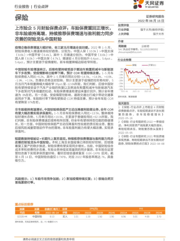 【天风证券】【20220615】上市险企5月财险保费点评:车险保费重回正增长,非车险维持高增-2页 行业研究