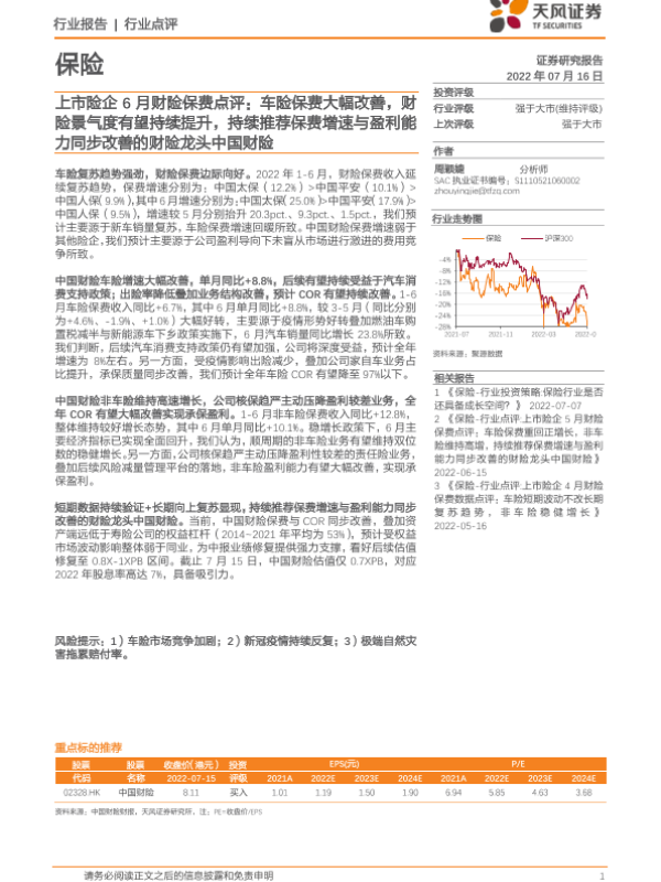 【天风证券】【20220716】上市险企6月财险保费点评:车险保费大幅改善,财险景气度有望持续提升-2页 行业研究