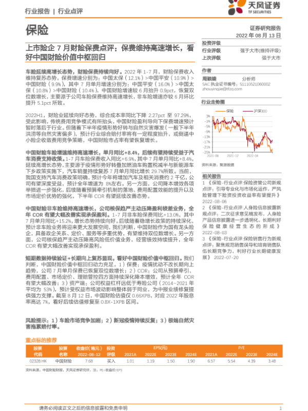 【天风证券】【20220813】上市险企7月财险保费点评:保费维持高速增长,看好中国财险价值中枢回归-2页 行业研究