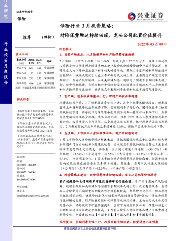 【兴业证券】【20220309】保险行业3月投资策略:财险保费增速持续回暖,龙头公司配置价值提升-18页 行业研究