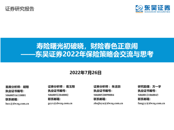 【东吴证券】【20220726】2022年保险行业策略会交流与思考:寿险曙光初破晓,财险春色正意闹-16页 行业研究