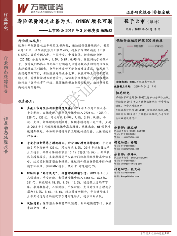 【万联证券】【20190418】上市险企2019年3月保费数据跟踪:寿险保费增速改善为主,Q1NBV增长可期-3页 行业研究