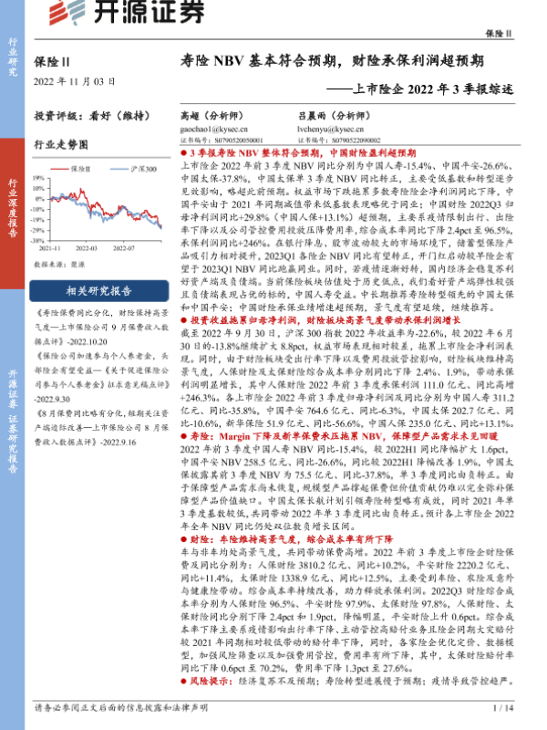 【开源证券】【20221103】上市险企2022年3季报综述-寿险NBV基本符合预期,财险承保利润超预期-14页 行业研究