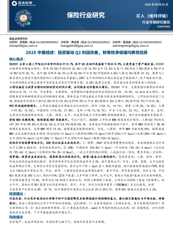 【国金证券】【202509】保险行业2025中报综述:投资驱动Q2利润改善,财寿险承保端均表现优异-20页 证券期货研究报告