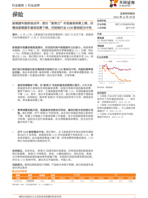【天风证券】【20211230】新能源车险新规点评:部分“新势力”车型基准保费上调,但整体新能源车基准保费下降,对财险行业COR影响较为中性-2页 行业研究