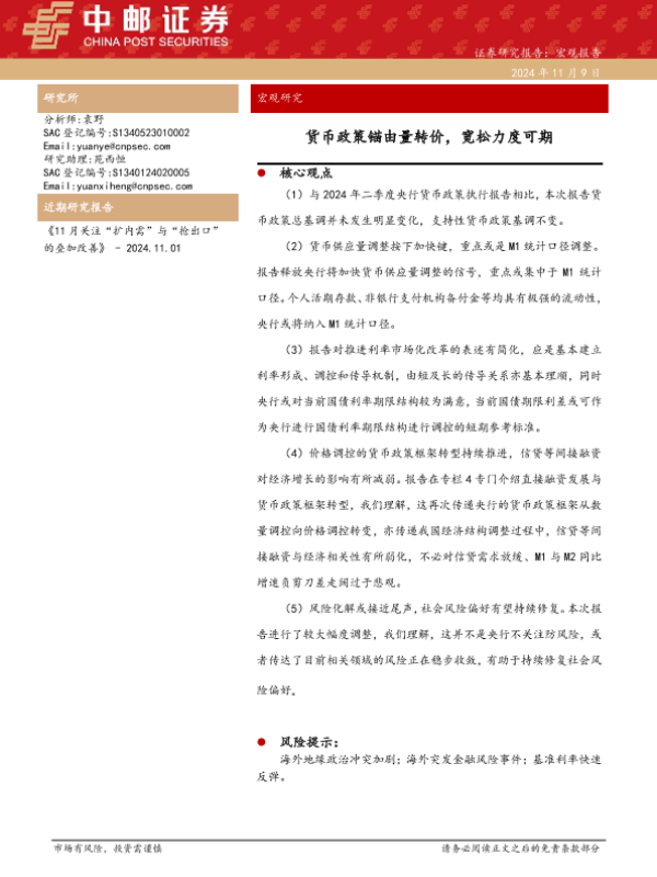 【中邮证券】【20241109】宏观研究:货币政策锚由量转价,宽松力度可期-13页 宏观策略