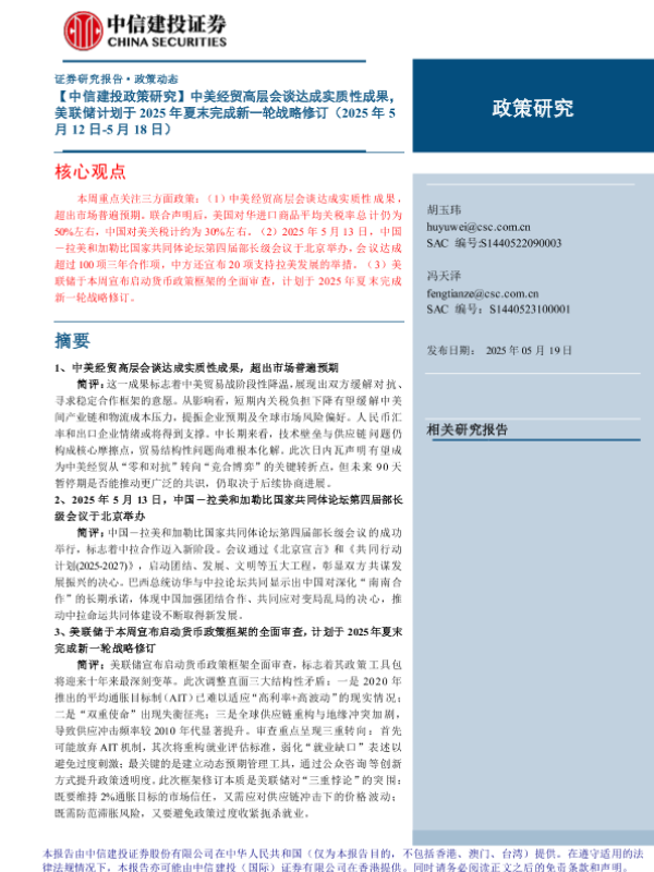 【中信建投证券】【20250519】中美经贸高层会谈达成实质性成果,美联储计划于2025年夏末完成新一轮战略修订-12页 宏观策略
