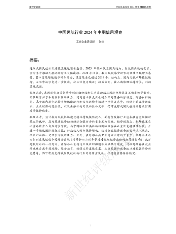 【新世纪评级】【2024】中国民航行业2024年中期信用观察-20页 行业研究