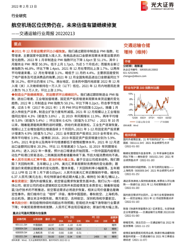 【光大证券】【20220213】交通运输行业周报:航空机场区位优势仍在,未来估值有望继续修复-9页 行业研究