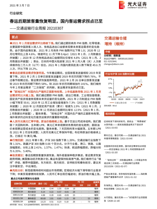 【光大证券】【20210307】春运后期旅客量恢复明显,国内客运需求拐点已至-8页 行业研究