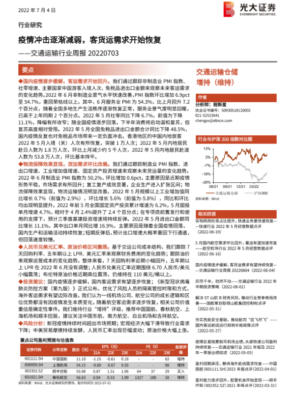 【光大证券】【20220704】交通运输行业周报:疫情冲击逐渐减弱,客货运需求开始恢复-9页 行业研究
