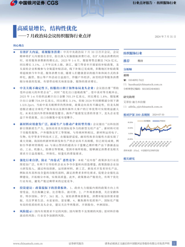 【银河证券】【20250731】7月政治局会议纺织服饰行业点评:高质量增长,结构性优化-2页 行业研究