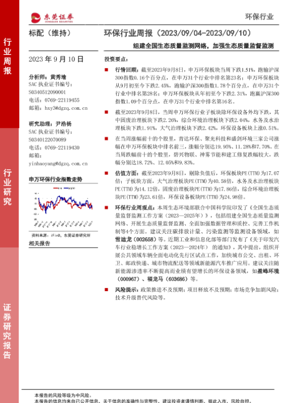 【东莞证券】【20230910】环保行业周报:组建全国生态质量监测网络,加强生态质量监督监测-13页 行业研究
