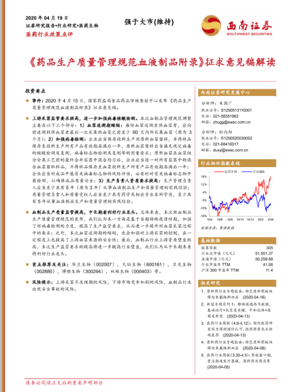 【西南证券】【20200419】药品生产质量管理规范血液制品附录征求意见稿解读-3页 行业研究