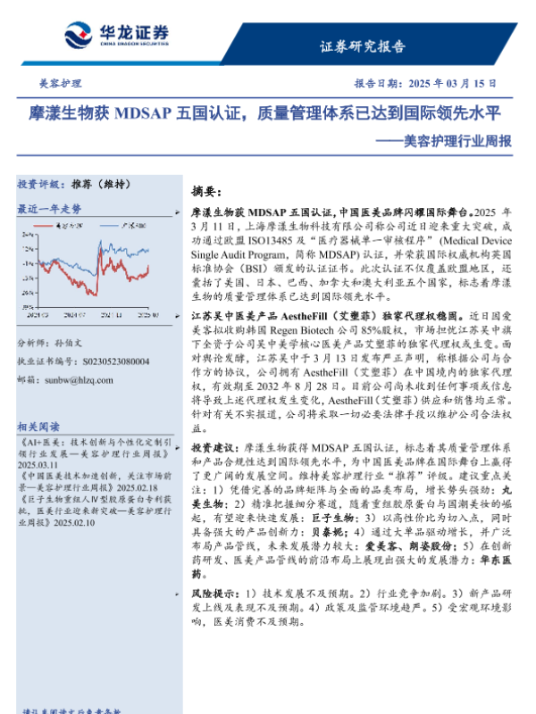 【华龙证券】【20250315】美容护理行业周报:摩漾生物获MDSAP五国认证,质量管理体系已达到国际领先水平-10页 行业研究