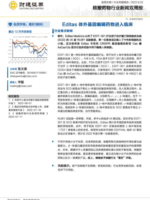 【财通证券】【20220802】核酸药物行业新闻双周报:Editas体外基因编辑药物进入临床-9页 行业研究
