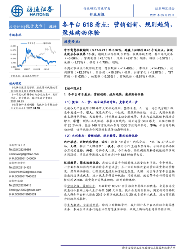 【海通证券】【20210523】商业贸易行业周报:各平台618看点:营销创新、规则趋简,聚焦购物体验-6页 行业研究