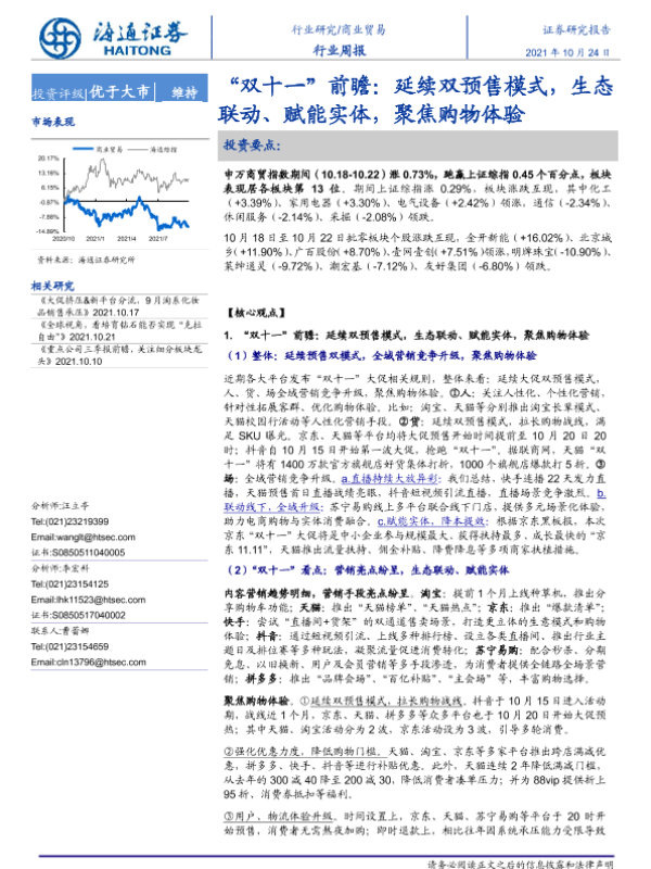 【海通证券】【20211024】商业贸易“双十一”前瞻:延续双预售模式,生态联动、赋能实体,聚焦购物体验-7页 行业研究