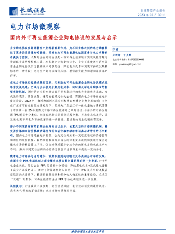 【长城证券】【20230530】电力市场微观察:国内外可再生能源企业购电协议的发展与启示-17页 行业研究