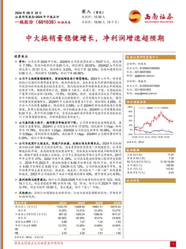 【西南证券】【20240830】一拖股份(601038)2024年中报点评:中大拖销量稳健增长,净利润增速超预期-10页 行业研究