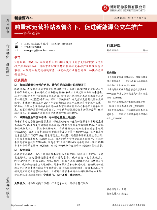 【浙商证券】【20190509】新能源汽车事件点评:购置和运营补贴双管齐下,促进新能源公交车推广-2页 行业研究