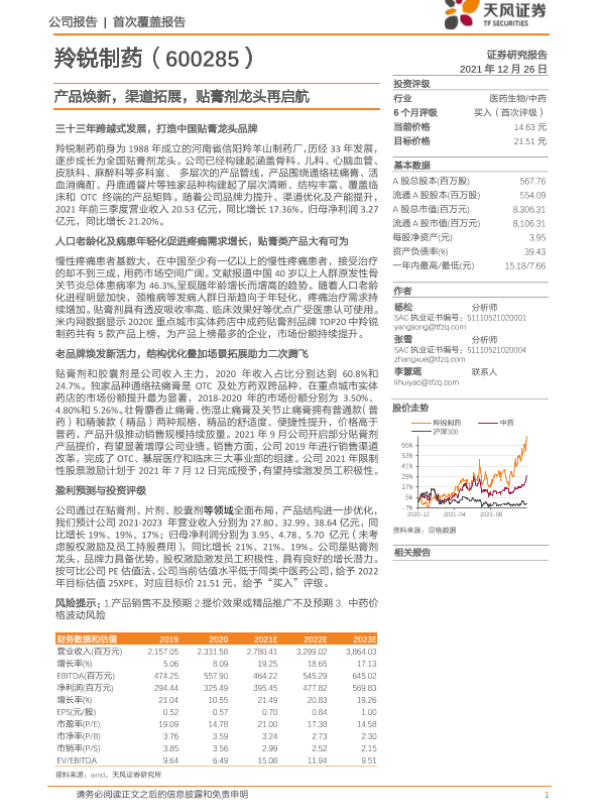 【天风证券】【20211226】羚锐制药-600285.SH-产品焕新,渠道拓展,贴膏剂龙头再启航-27页 行业研究