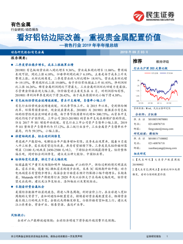 【民生证券】【20190903】有色行业2019年半年报总结:看好铝钴边际改善,重视贵金属配置价值-26页 行业研究