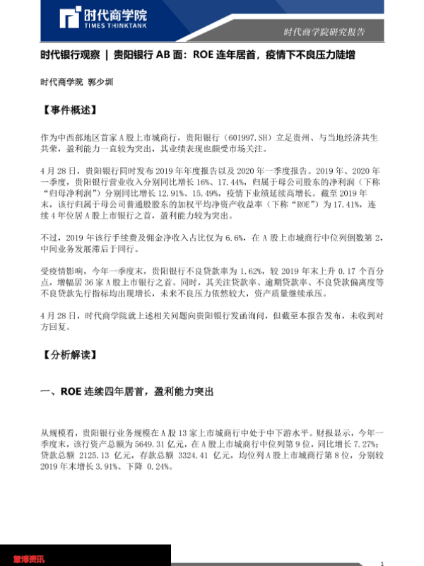 【时代商学院】【20200508】贵阳银行AB面:ROE连年居首,疫情下不良压力陡增-7页 行业研究
