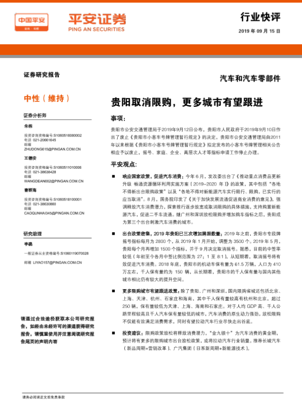 【平安证券】【20190915】汽车和汽车零部件:贵阳取消限购,更多城市有望跟进-3页 行业研究