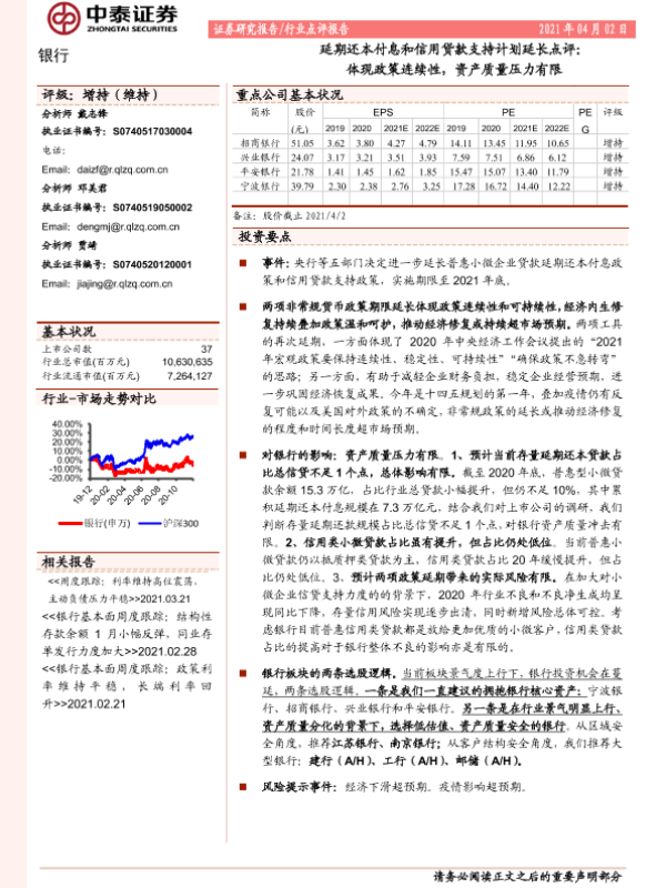 【中泰证券】【20210402】延期还本付息和信用贷款支持计划延长点评:体现政策连续性,资产质量压力有限-8页 行业研究