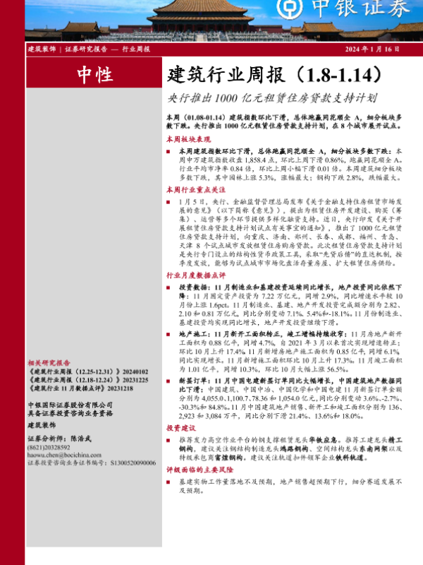 【中银证券】【20240116】建筑行业周报:央行推出1000亿元租赁住房贷款支持计划-16页 行业研究